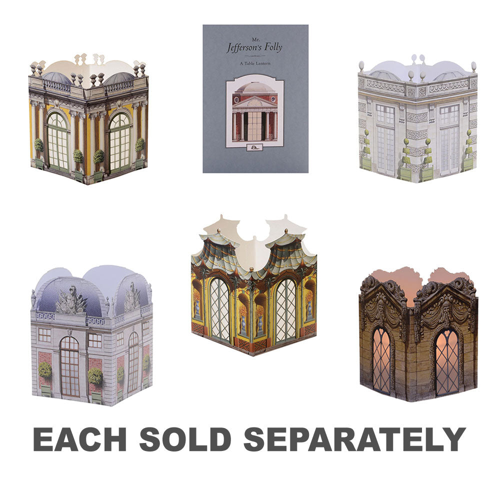 THE BELVEDERE TABLE LANTERN depicts a finely detailed classical pavilion, printed on heavy-weight stock with die-cut windows backed by translucent paper. Place a tea light inside and the pavilion glows with festive cheer.
