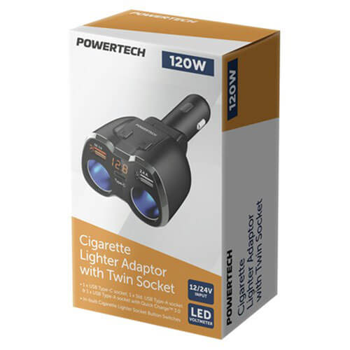 Dit apparaat converteert de lichtere aansluiting in uw auto naar dubbele sigarettencontacten met 1 x USB A 2,4amp -aansluiting en 1 x USB C 1 X USB A Qualcomm 3.0 Quick Charge Cocket. Het ingebouwde LED -display toont ook de huidige spanning van de sigarettencontinois waar hij op is aangesloten. Met de ingebouwde schakelaars kunt u de sigarettenkassen afzonderlijk in- of uitgeschakeld op de adapter instellen.