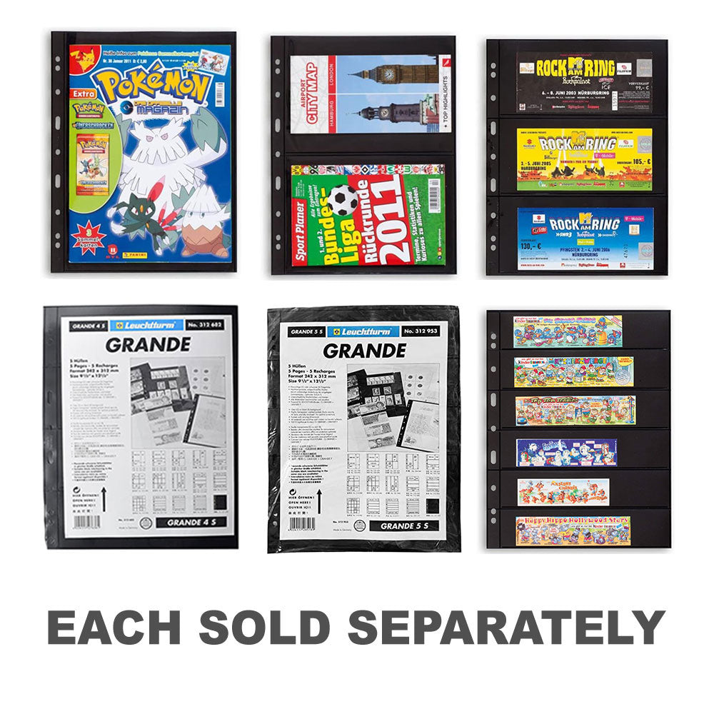 - Black plastic pocket sheets tailored for Leuchtturm Grande ring binders.