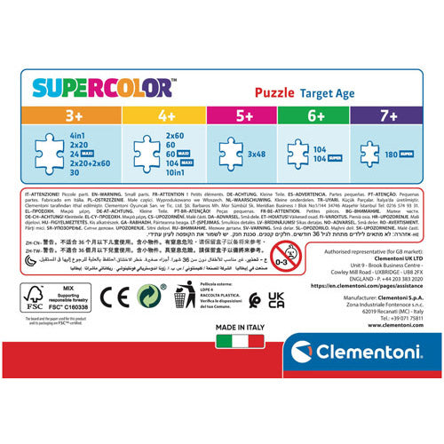 Children's jigsaw puzzle with 60 pieces Size of completed jigsaw puzzle: 33,5 x 23,5 cm A vast array of jigsaw puzzles specially designed for kids to help them hone their powers of observation as well as their logical and manual skills. Captivating images with vibrant appealing colours, depicting children's most beloved characters for hours of fun with friends and family. Acutely attuned to the importance of environmental awareness, Clementoni makes extensive use of recycled materials and avoids any components containing pollutants. Made in Italy.