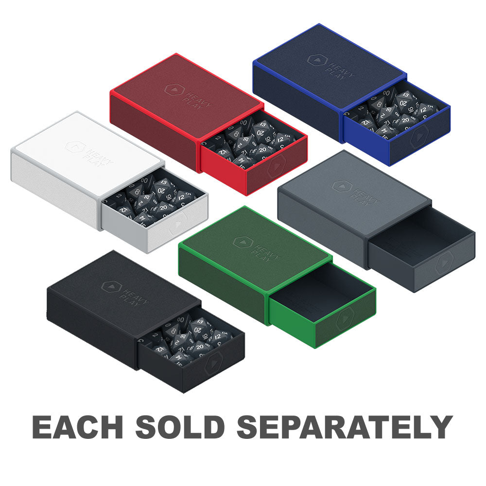The ultimate dice box. Fits 4x D20 spindowns, a full set of 7x RPG dice, and a bunch of extra D6's or tokens. Magnetic tray slides out and pops on top for easy dice access during gameplay. Durable vegan leather exterior. Soft microfiber lining to dampen rattling.