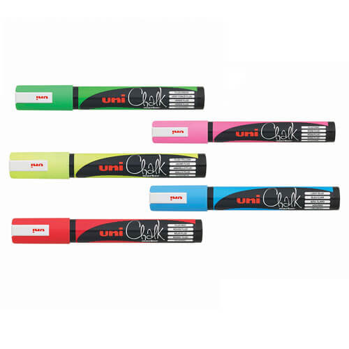 Uni Liquid Chalk Markers utilise water-based pigment ink so you can mark on windows, glass, mirrors, plastic and metal surfaces with ease. The ink won't wash off in the rain, yet is easy to remove with a damp cloth. For permanent application the markers can also be used on chalkboards for a bold statement.
