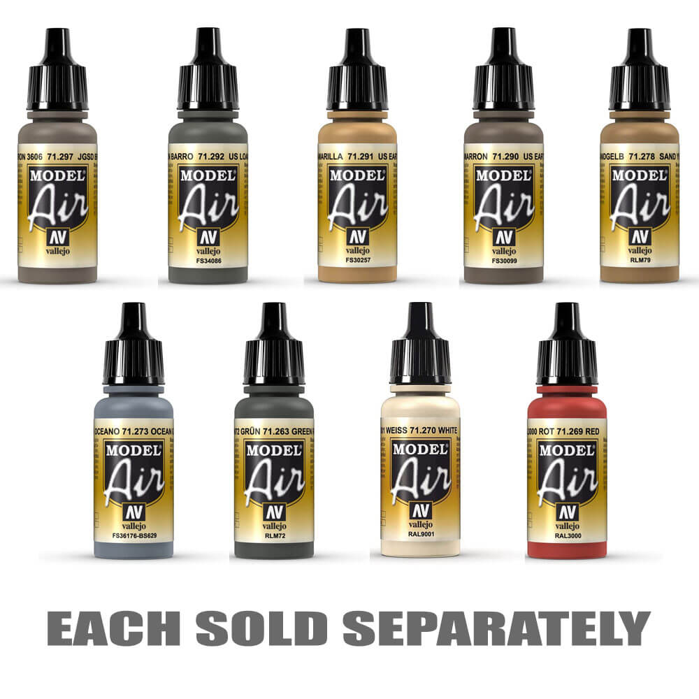 Model Air is a range of liquid acrylic colours developed especially for airbrush techniques, with very finely ground pigments and an acrylic resin with properties of extreme resistance and durability. The formula contains a new acrylic resin with properties until now impossible to obtain in a waterbased acrylic. The resistance, hardness and covering power of Model Air is superior to any known acrylic for airbrushing. The pigments used for airbrush colours need to be ground to the finest possible consistency to avoid obstruction of the airbrush valves. The revolutionary milling process of the pigments used in the Model Air formula gives the model painter technical assurance and finest texture when applying the colours to the model, and produces a very superior quality when applying the colours with a brush for minuscule details, for washes and transparencies and layered application of diluted glazes