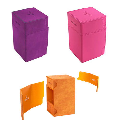 La torre de vigilancia convertible combina caja de cubierta, cajón de accesorios y soporte de cartas en una caja elegante. El soporte de la tarjeta puede mantener hasta 100 tarjetas de doble manga, protegidas por un revestimiento de microfibra interno suave. El cajón de accesorios es perfecto para albergar dados, fichas y otros artículos pequeños.
