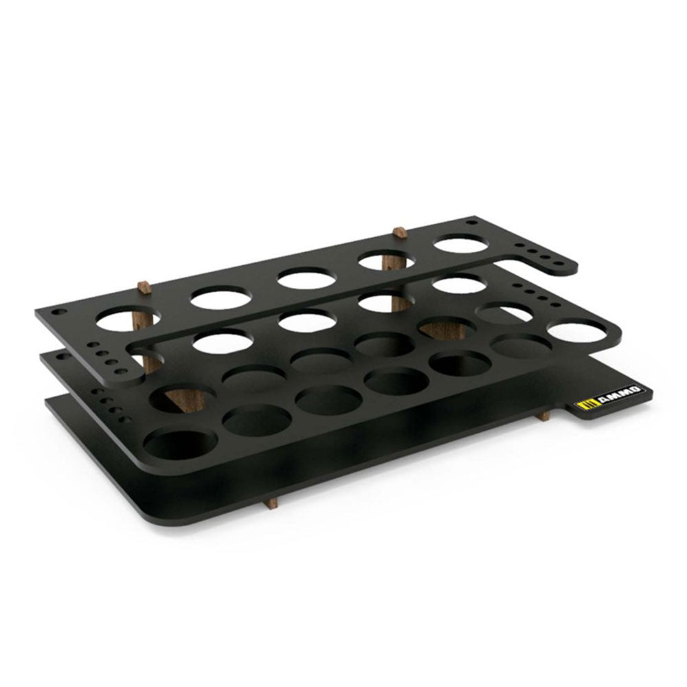 Módulo fabricado en acabado de satén negro, ideal para botellas de munición de 18 x 17 ml de pintura acrílica Mig Jiménez o 5 botellas de colores Dio DryBrush. Acomoda 10 cepillos de varios tamaños.
