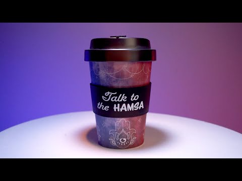 - Bijpassende zwarte anti-spill-deksel en beschermende siliconenband met punny-zin 'Praat met de Hamsa'.