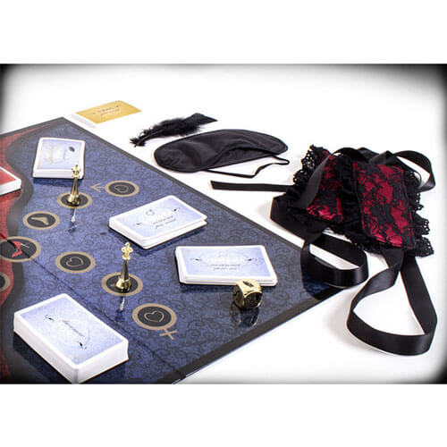• Wat zit er in de doos: 252 kaarten; spelbord; 2 metalen pionnen; metalen dobbelstenen; stijlvolle handboeien; blinddoek; zweep; veerkracht; geurkaars; rozenblaadjes; rulboek