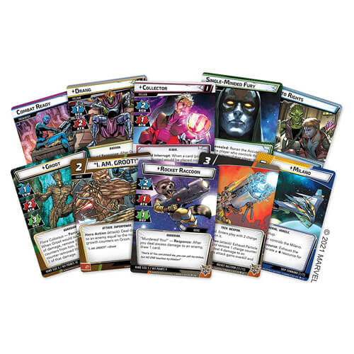 - Onwaarschijnlijke helden: Binnen de meest gezochte Galaxy zul je twee vooraf gebouwde heldendekken vinden om je klaar te maken om te vechten naast de Guardians of the Galaxy: Groot en Rocker Racoon.