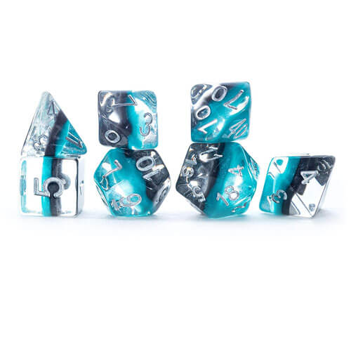 • Couleurs: noir de minuit et rêves de sarcelle - Numéro de l'argent. Les dés d'éclipse sont des dés en couches (4) avec deux minces couches de couleur narquée vif nichée entre deux couches extérieures transparentes parfaitement claires!