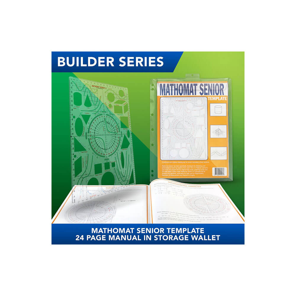 Mathomat Senior a été spécifiquement développé pour les esquisses et la présentation des travaux scolaires supérieurs. Mathomat Senior comprend un rapporteur central qui est également le cercle unitaire pour l'étude de la trigonométrie. Une ligne tangente qui peut être utilisée avec le cercle unitaire. Courbes graphiques pour les courbes de distribution de distribution de fréquences singulières, de cosinus, de tan, quadratiques, cubiques, paraboliques, hyperboliques et de fréquence normales. Mathomat Senior comprend des formes et des contours de croquis pour les solides 3D utilisés dans la zone et le calcul du volume.