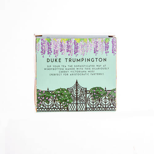 みんなおなら - 公爵や公爵夫人でさえ!この陽気な斬新な「デューク・トランピントン」ビクトリアナ・マグカップには、「ウィンディボトムマナーのデューク・トランピントン」が楽しいテキストで完成しています。ゴージャスな青いマグカップに印刷され、高品質のグラフィック装飾的なギフトボックスに表示されたこの楽しい引用マグカップは、誕生日やクリスマスに彼にとって完璧なギフトであり、トランピントンの家に公式に紹介します(当然のことです)!
