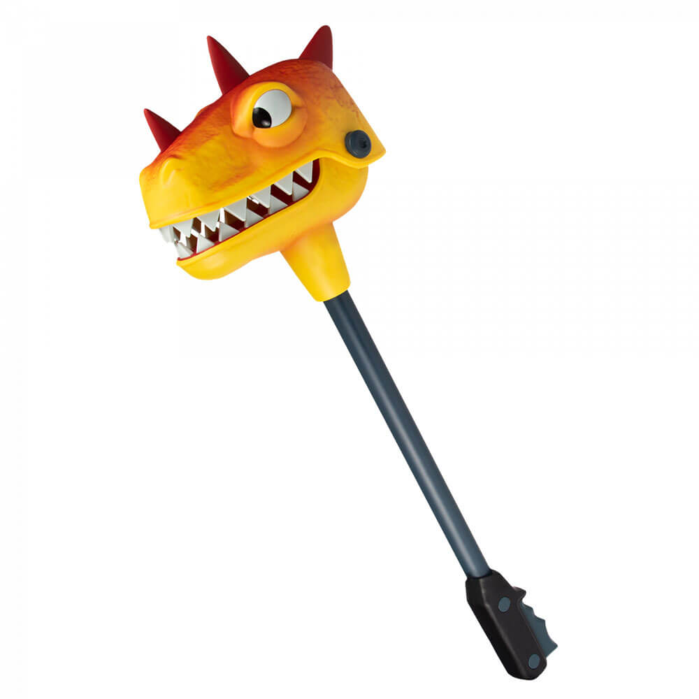 ビットマークの等身大のレプリカは、ピタクセ(別名収穫ツール)の壮大な肌のゲーム内資産から直接設計されています。古典的なスナッパーのおもちゃに似た、棒の上に激しく激しい恐竜の頭があり、プレミアムな光沢のあるFortniteをテーマにしたパッケージで展示されています。