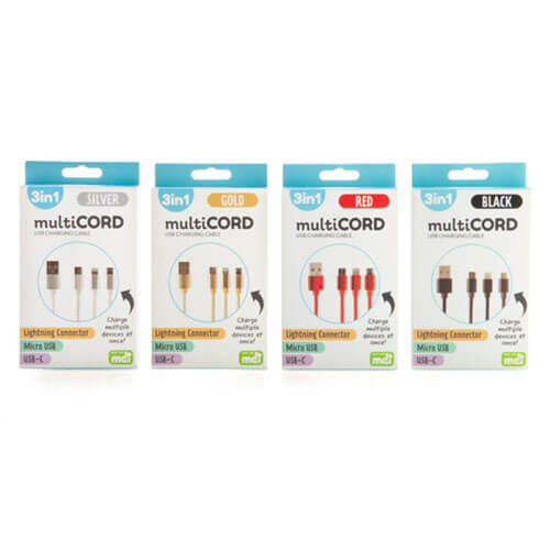 3つの異なるコネクタタイプを備えた多機能充電コード。
