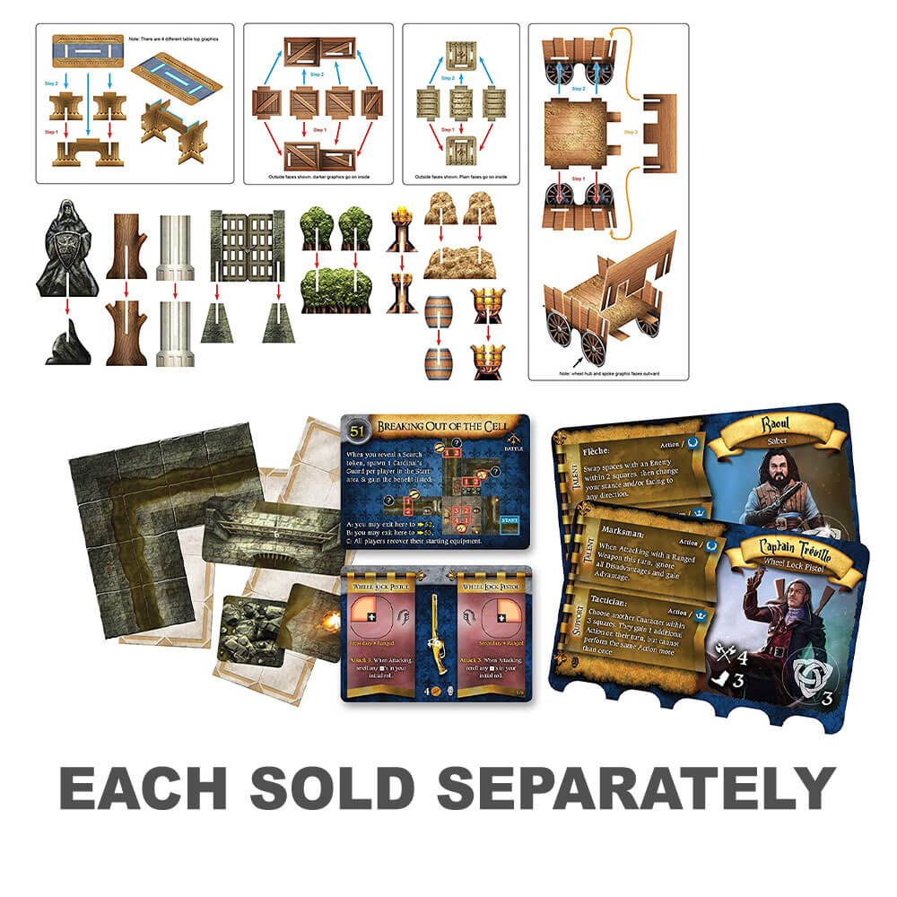 Bevat slot-gelijktijdig kartonnen objecten voor alle terreintegels die worden gebruikt in de erfenis van Gaskon, plus de uitbreidingen: de man in het ijzeren masker en de graaf van Monte Cristo.