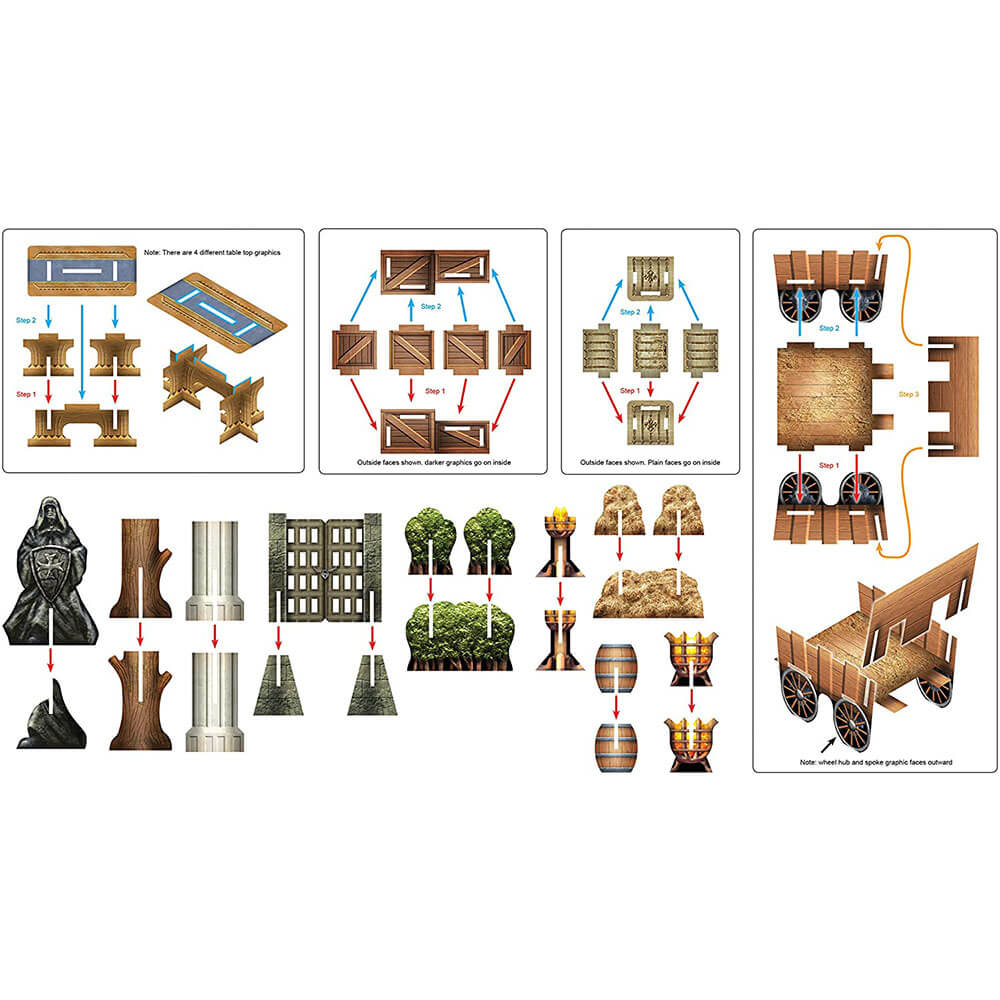 - Het pakket bevat ongeveer 4-5 punchborden gevuld met snelle geassembleerde obstakels, waaronder (maar niet beperkt tot): vaten, potplanten, kisten, meubels (stoelen en tafels), pilaren, rotsen en struiken, deuren, vlammen van hoop, en wanhoop urnen.