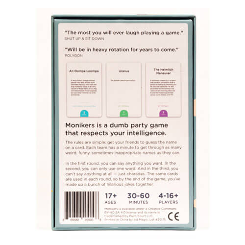 Monikers é um jogo de festa baseado na celebridade do jogo de domínio público, onde os jogadores se revezam tentando fazer com que seus colegas de equipe adivinhem nomes descrevendo ou imitando pessoas conhecidas.