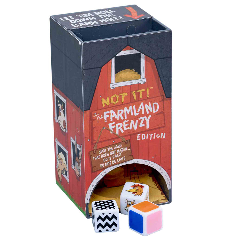 Spot the card that does NOT match! Do it fast... Do NOT be last! Can you find a card in your hand that does not match any of the attributes revealed on the 3 dice that tumble from the dice tower and onto the table? Find it as quickly as you can and slam it on the table and yell, "NOT IT!"